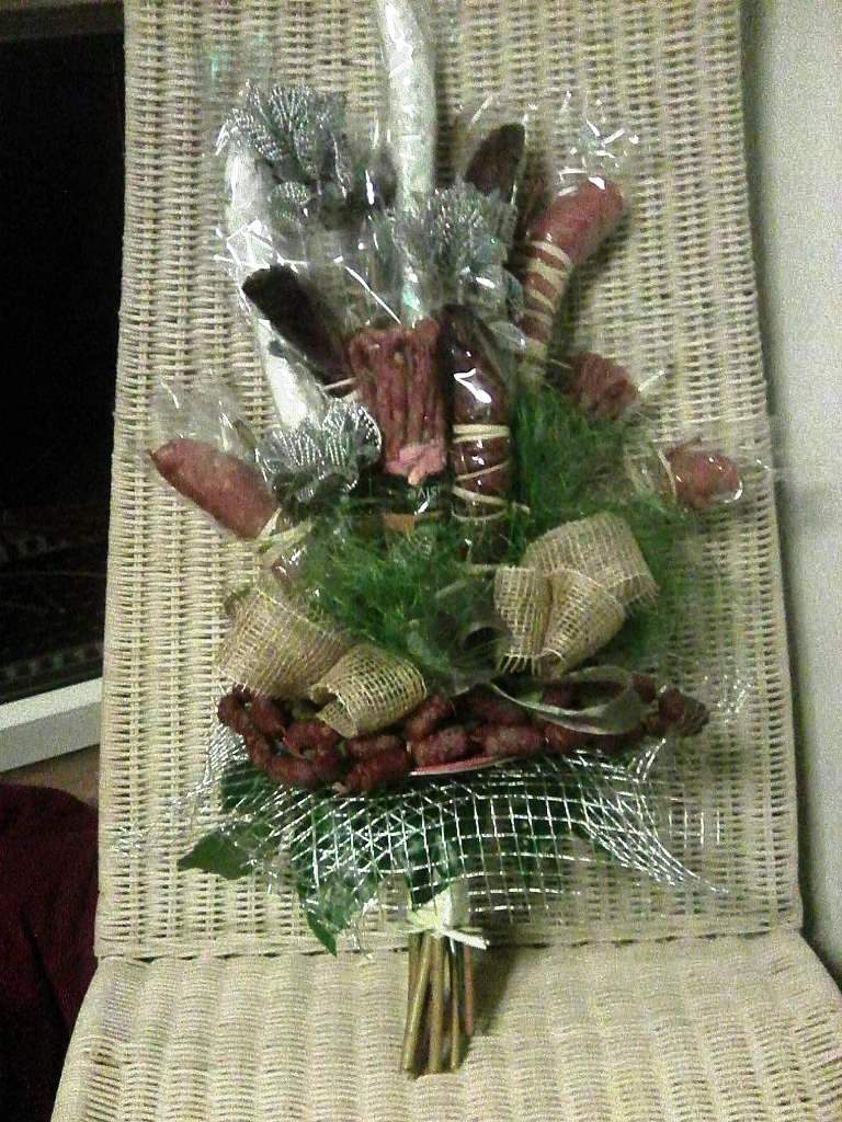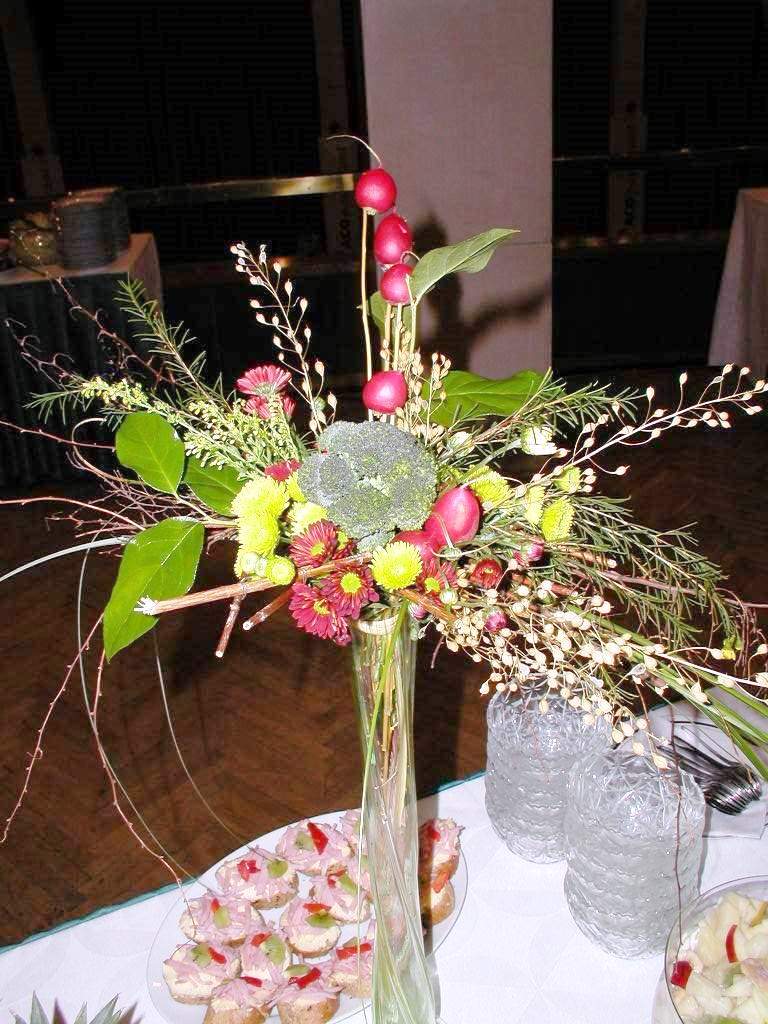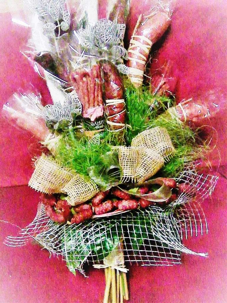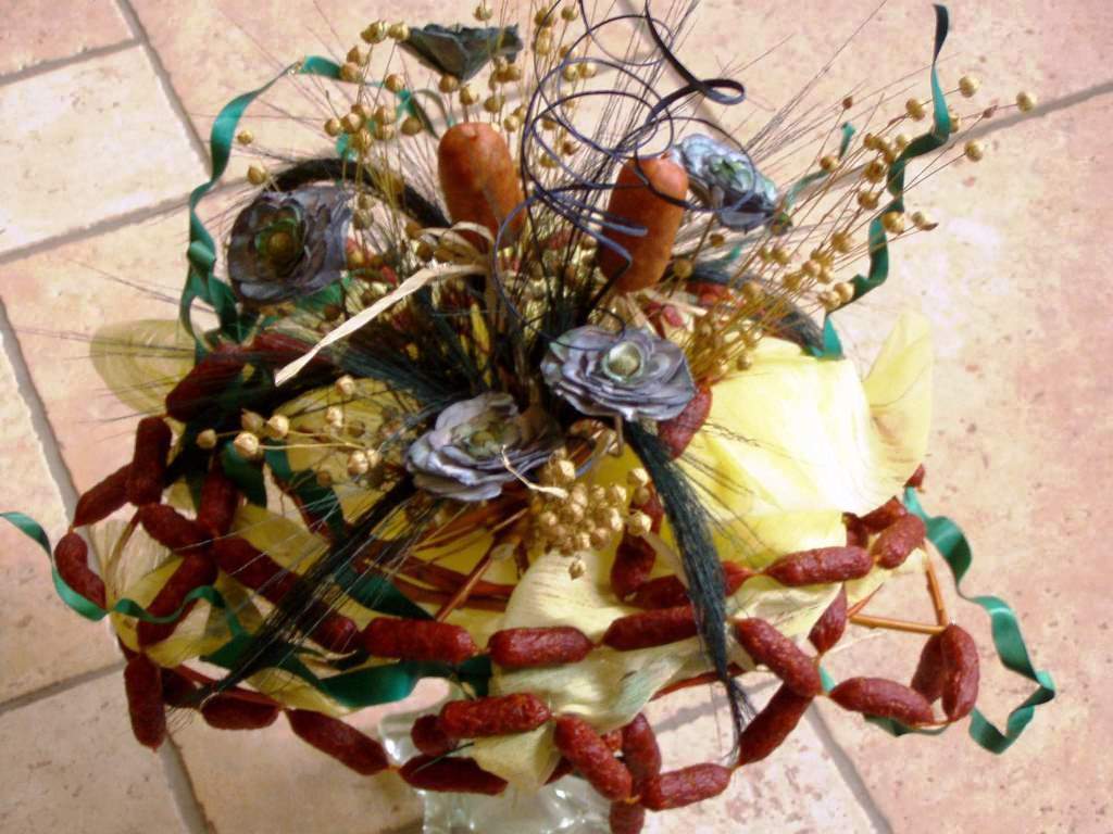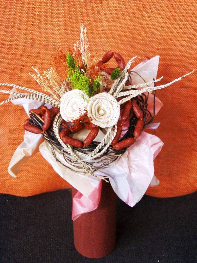 Proč tedy nespojit jídlo a krásu květiny. Jedno i druhé se dá aranžovat, tak aby potěšilo oko, ostatní smysly, ducha i srdce. Proč tedy nepotěšit svého milého klobásovou kyticí nebo pěkně ozdobenou lahvinkou nečeho dobrého. I dámy si mohou přijít na své v méně kalorické sýrové nebo zeleninové kytici.
